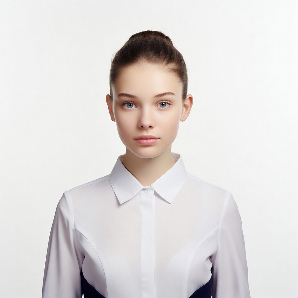 A young woman with brown hair in a bun faces the camera directly against a white background. She wears a white collared shirt with long sleeves and has light blue eyes. Her expression is neutral with a slight pout.