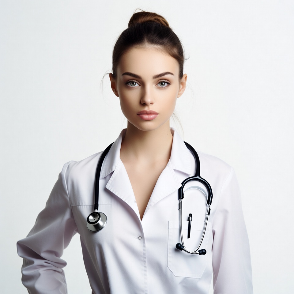 A young woman with brown hair in a bun wears a white doctor's coat and a stethoscope around her neck. She stands confidently against a plain white background with a neutral expression. The stethoscope hangs prominently over her chest.