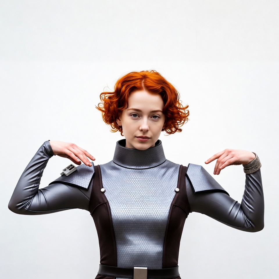 A woman with curly red hair poses confidently on a white background, wearing a metallic silver sci-fi armor suit with shoulder pads and high collar. She extends her arms outward with hands posed dynamically, showcasing silver bracelets on her wrists. The futuristic outfit features black accents and a belt buckle.
