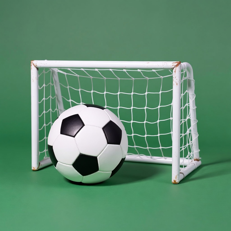 A black and white soccer ball sits in front of a small white soccer goal net on a bright green background. The goal frame shows slight rust on the edges. The ball is positioned close to the net, centered in the image.