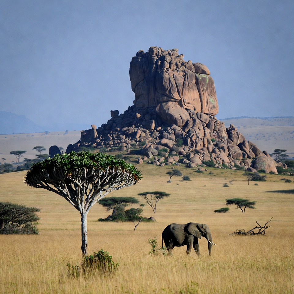 Africa, African elephant, acacia tree, animals, blue sky, golden grass, grassland, isolated background, landscape, mountains, nature, rock formation, rocky outcrop, safari, savanna, wildlife, elephant