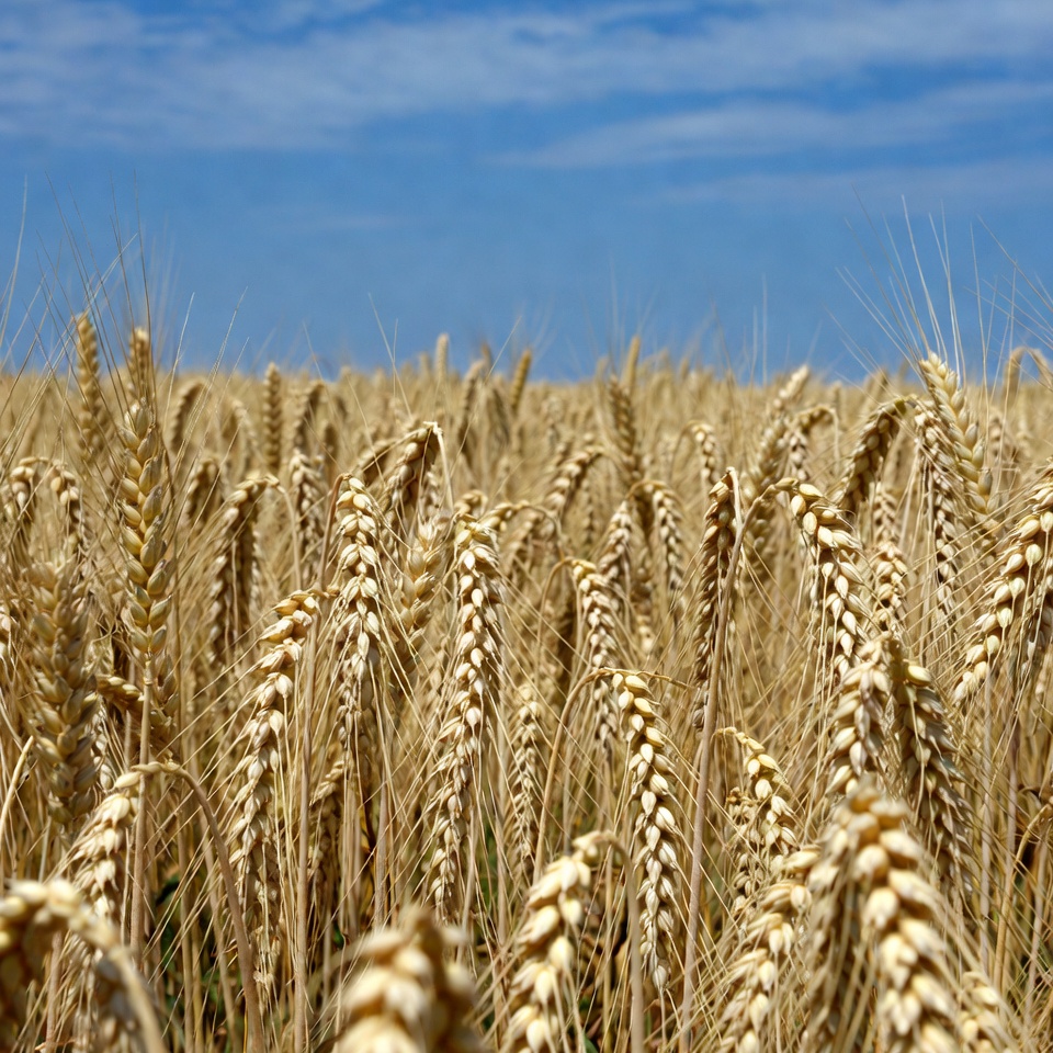 A vast field of golden wheat sways under a clear blue sky with scattered white clouds. The wheat stalks are tall and dense, filling the foreground and extending to the horizon. Sunlight illuminates the ripe grain heads.