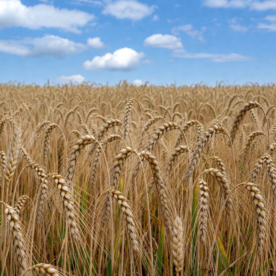 agriculture, blue sky, cereal crop, clouds, crop field, farmland, field, golden wheat, grain field, growth, harvest, idyllic landscape, nature, outdoors, ripe wheat, rural landscape, sky, summer, sunny day, vast field, wheat crop, wheat ears, wheat stalks, white clouds, wheat field