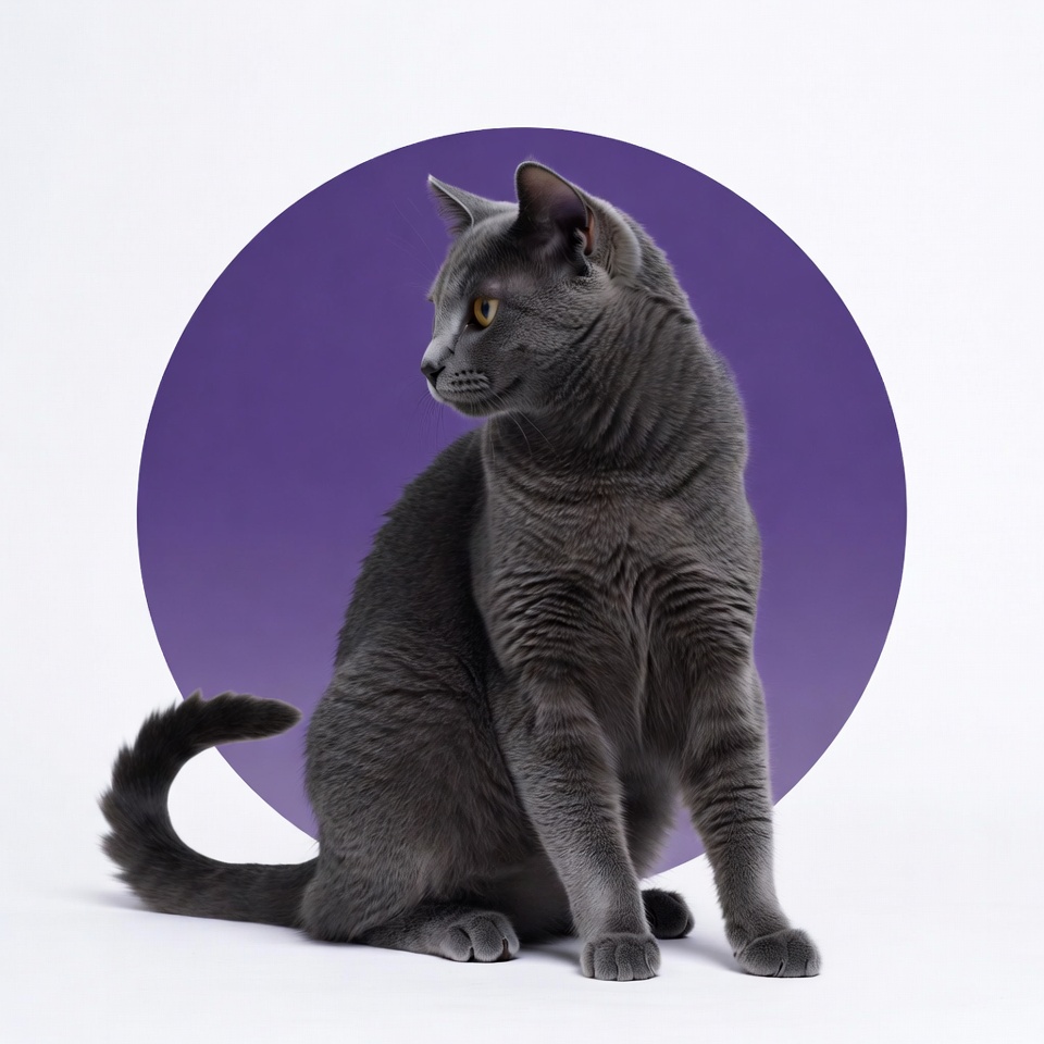 Russian Blue, animal, attentive cat, bushy tail, cat, feline, fluffy fur, isolated background, pet cat, purple background, side view, sitting cat, yellow eyes, gray cat
