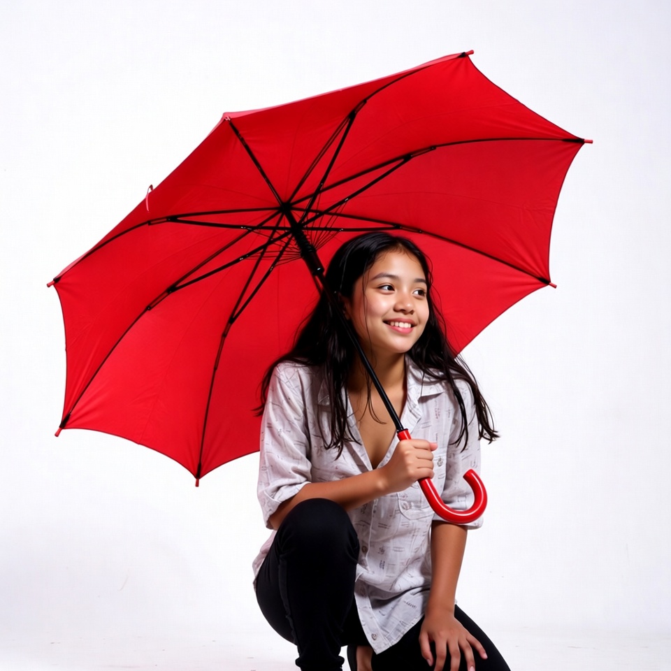 A young Asian girl with long dark hair smiles while holding a bright red umbrella over her shoulder. She wears a light gray collared shirt and black pants, kneeling on a white background. The umbrella is open and prominently featured above her.
