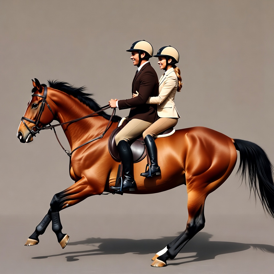 A man and woman wearing riding helmets and formal equestrian attire sit together on a chestnut brown horse in motion. The horse has a black mane and tail, with the pair holding the reins. They ride against a plain beige background.