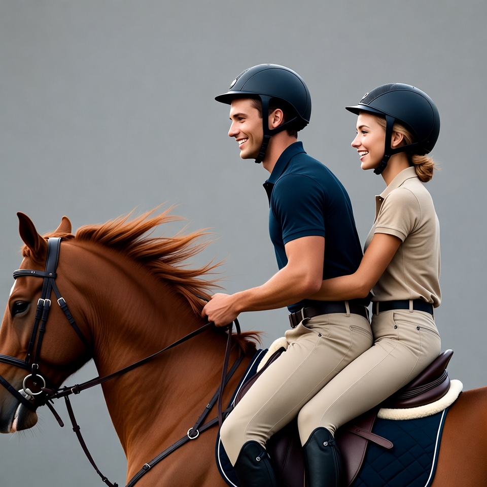 A smiling man and woman wearing helmets and equestrian outfits ride a brown horse side by side. The man has his arm around the woman as they sit on the horse's saddle against a gray background. The horse has a flowing red mane and wears a bridle.