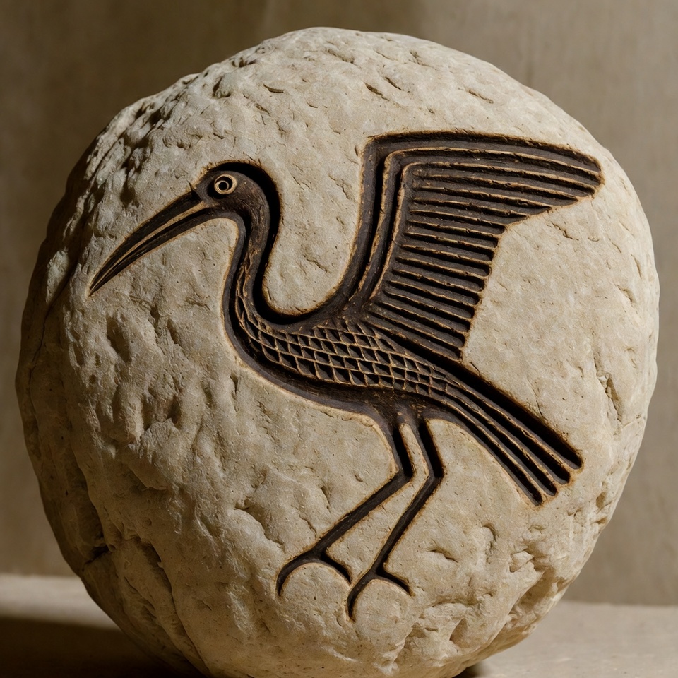 ancient style, art, beige stone, bird, incised design, isolated background, legs, long beak, round stone, sculpture, sphere, stone carving, textured surface, wildlife art, wings, heron
