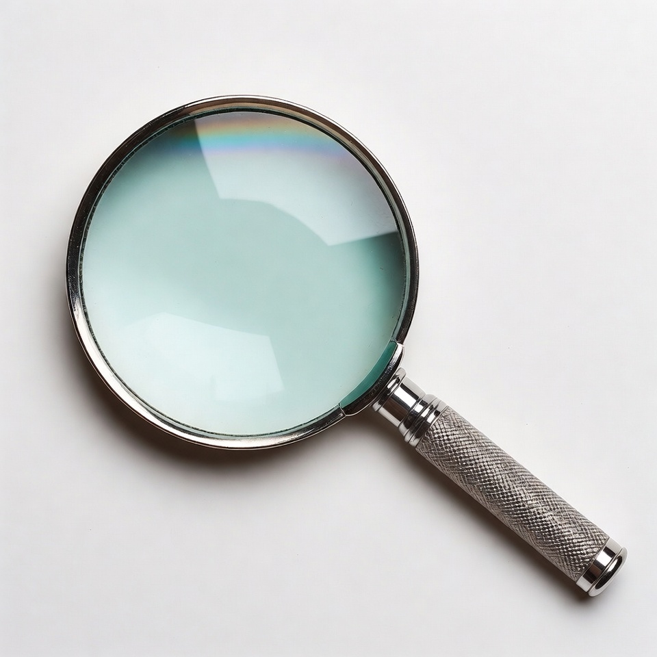 blue tint, clear glass, close-up, detective, inspection, isolated, lens, loupe, macro, magnifier, object, reflection, research, search tool, silver handle, textured grip, tool, white background, zoom, magnifying glass
