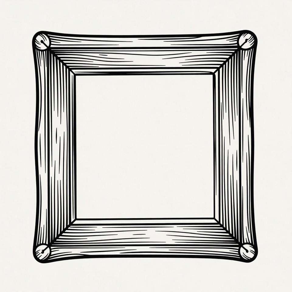 A hand-drawn black line art illustration of a square wooden picture frame. The frame features thick, curved wooden planks with crosshatching for texture and rounded corner joints. It stands alone on a white isolated background.
