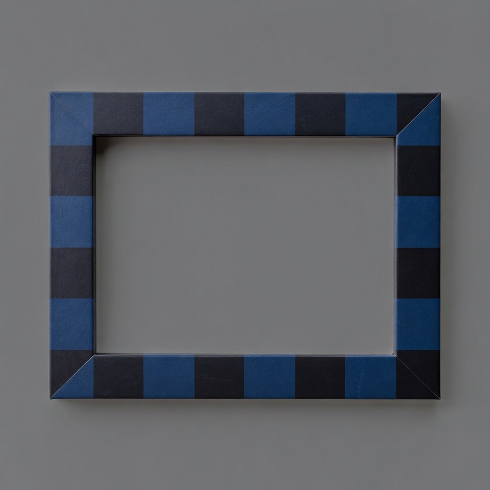 A rectangular picture frame features a plaid pattern of alternating blue and black squares. The frame has a thick border and is positioned on a plain gray background. The interior of the frame is empty.