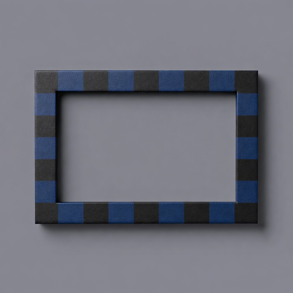 A rectangular picture frame features a black and blue plaid pattern on a gray background. The frame has a wide border with alternating black and blue squares. The center is empty and gray.