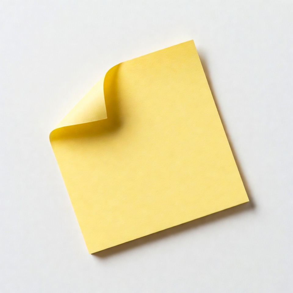 A single yellow sticky note is curled at the corner on a plain white background. The note is blank and positioned diagonally. It appears slightly lifted to show the underside.