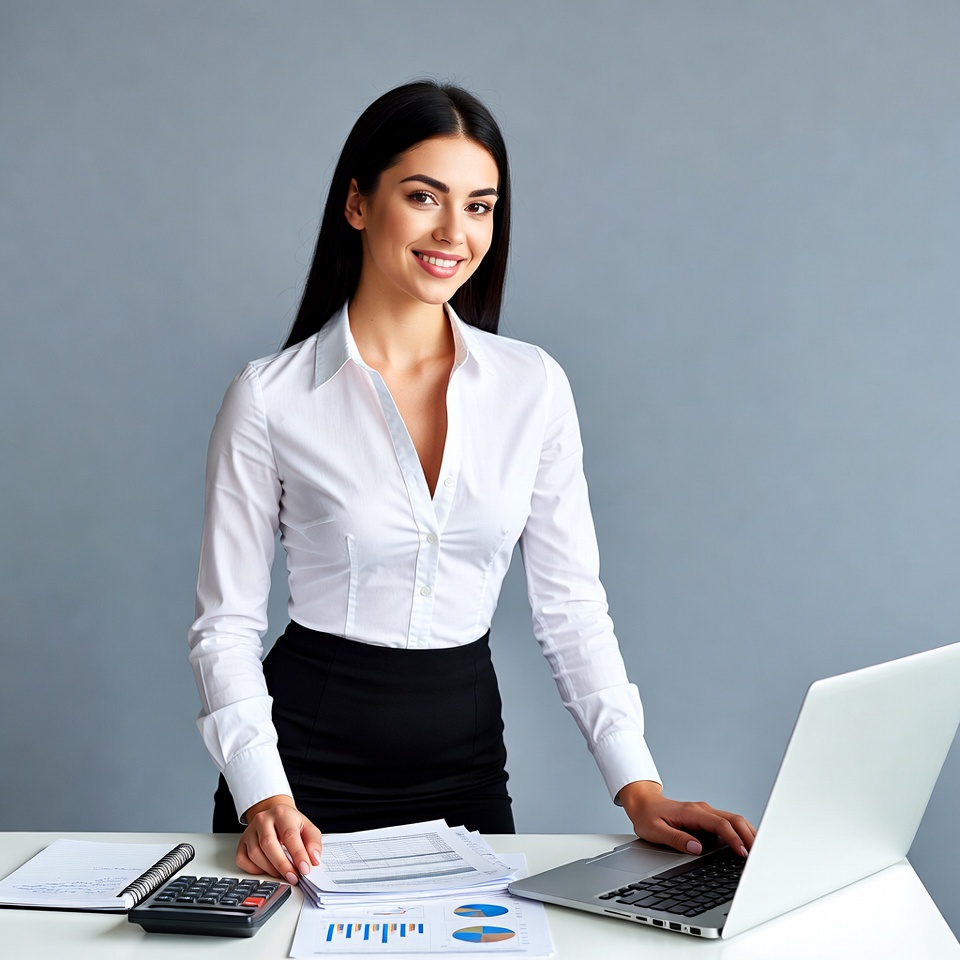 A smiling woman with long dark hair stands at a desk in a white blouse and black skirt. She holds documents and a calculator while a laptop and charts are on the table. The background is plain gray.