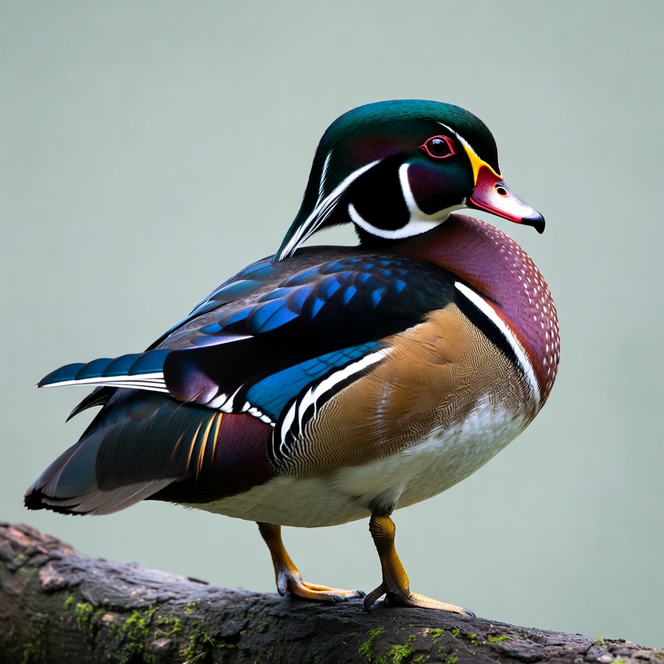 A male wood duck stands on a mossy log against a light green background. It features vibrant green head, red eyes, white markings, and multicolored feathers including blue wings and orange chest. The duck poses sideways with its wings slightly folded.