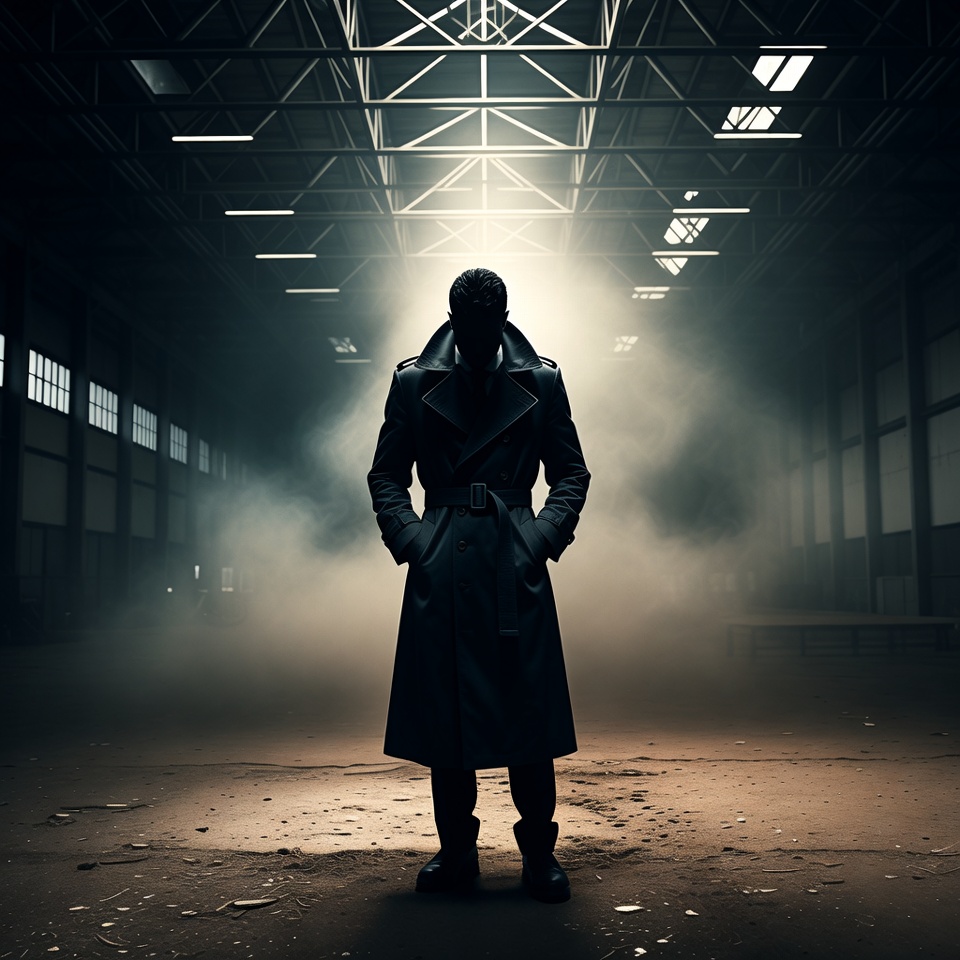 atmospheric, boots, concrete floor, dark, dramatic lighting, factory, fog, hands in pockets, industrial, interior, long coat, male, metal beams, mist, mysterious, noir style, overhead lights, shadows, silhouette, spotlight, standing, trench coat, warehouse, windows, man
