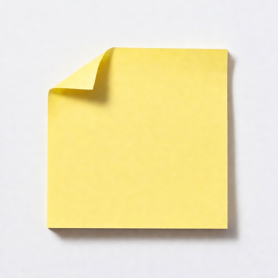 A yellow sticky note with one corner curled up and peeling away. It is positioned on a plain white background. The note is blank and square-shaped.