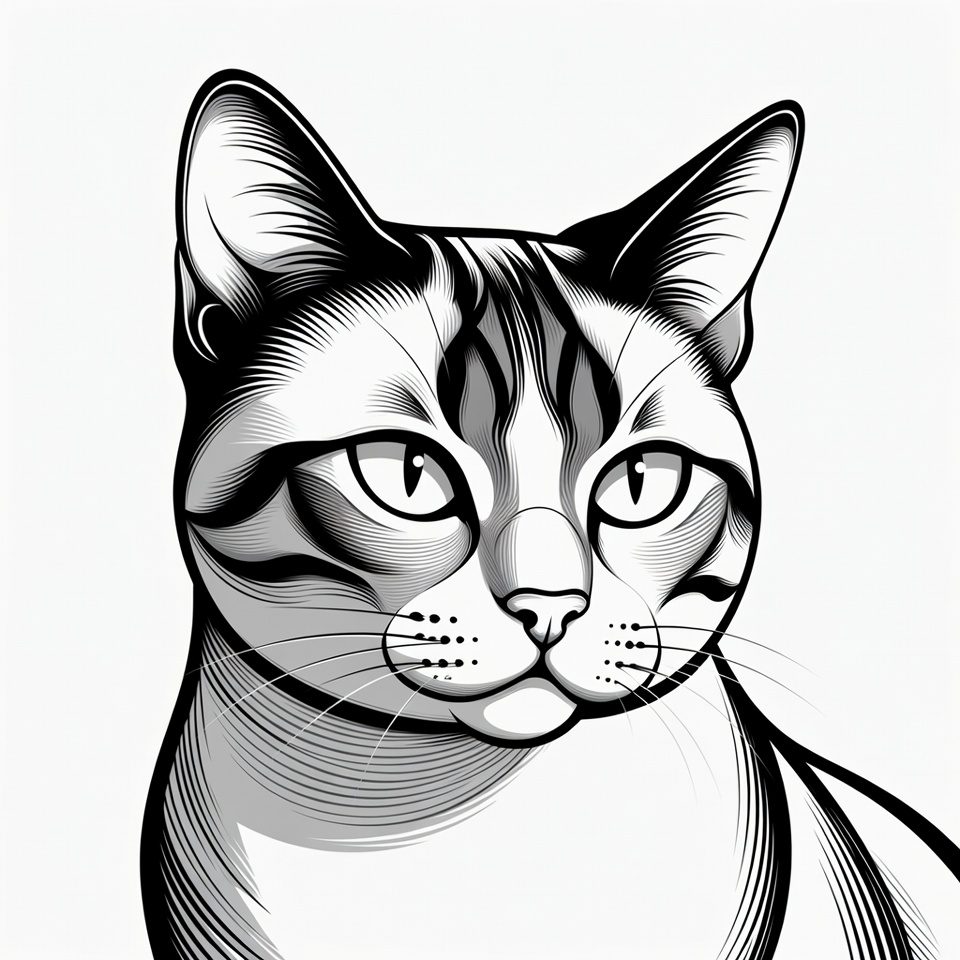 animal, black and white, cute cat, drawing, ears, eyes, feline, fur, illustration, isolated background, line art, portrait, stripes, tabby cat, vector art, whiskers, cat