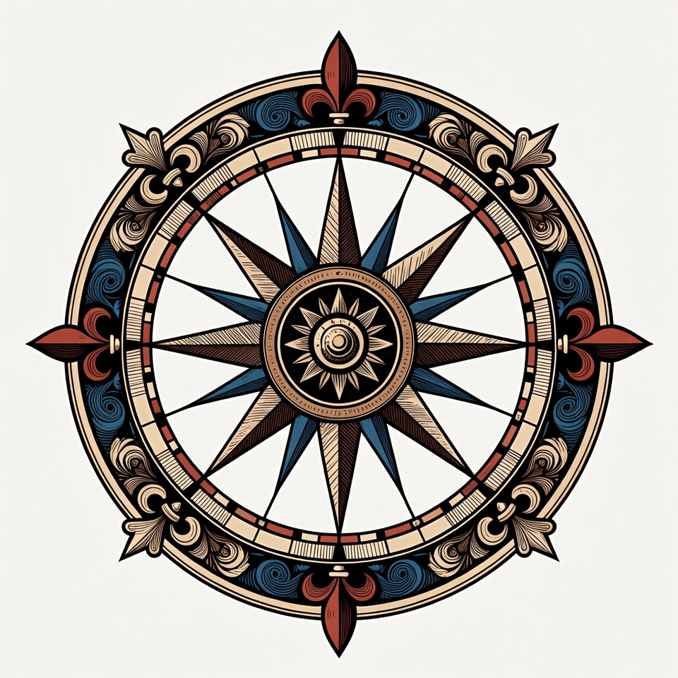 A detailed vector illustration of a traditional compass rose features intricate floral fleur-de-lis designs at the cardinal points. The compass has a central starburst with wooden textures, surrounded by elaborate gold, blue, and red ornamental patterns on a white isolated background. It displays classic directional markings in a circular vintage style.