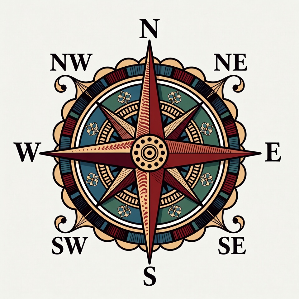 adventure, clipart, colorful, compass rose, directions, east, floral patterns, geometric design, illustration, isolated background, map, navigation, north, northeast, northwest, ornate, red compass, south, southeast, southwest, teal accents, travel, vector, west, compass