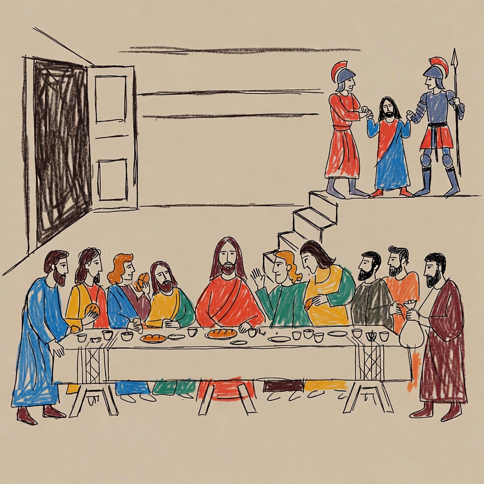 A colorful illustration depicts Jesus seated at the center of a long wooden table with twelve apostles during the Last Supper. They wear robes in various colors and share bread, fish, and wine from plates and cups. In the background, two armored soldiers escort a figure with a red robe up stairs near an open door.