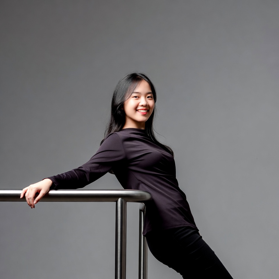 A young Asian woman with long straight black hair smiles happily while leaning on a metal railing. She wears a dark long-sleeved top and black pants, posing with one arm extended along the rail. The background is a plain gray studio setting.