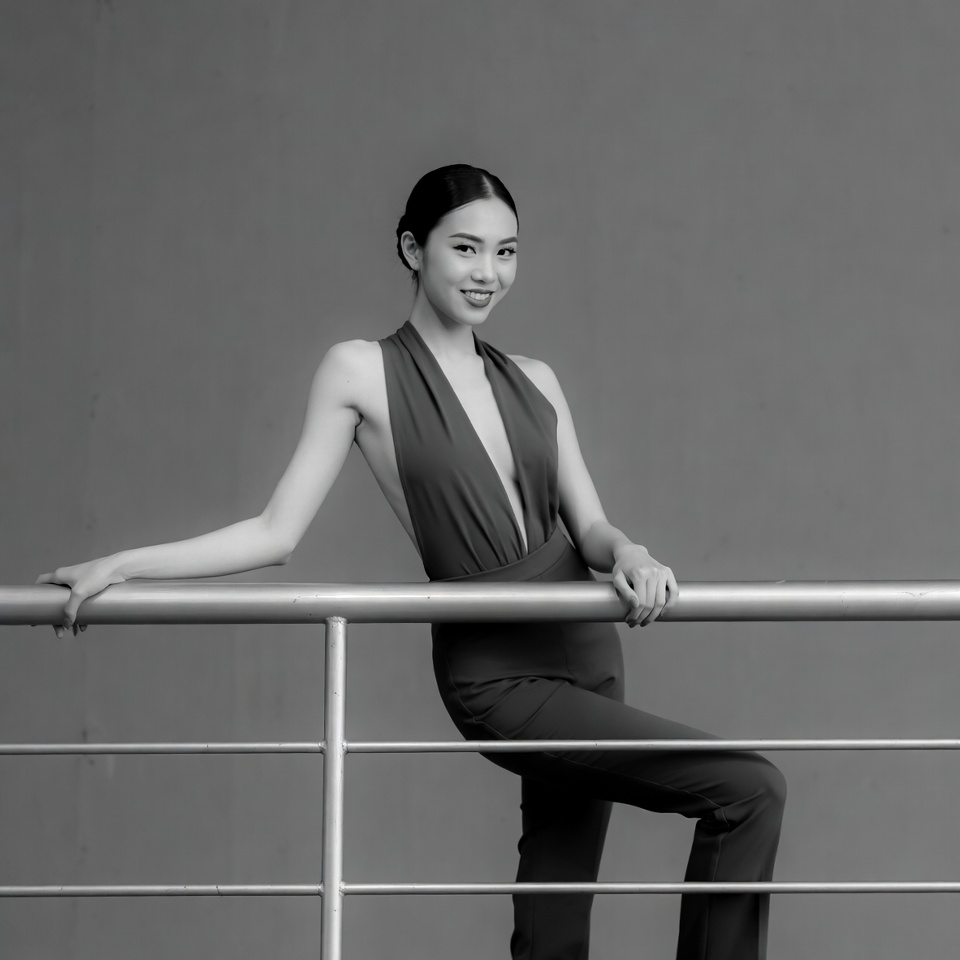 A young Asian woman with her hair in a bun smiles while leaning on a metal railing. She wears a sleeveless dark halter jumpsuit with a deep V-neckline. The image is in black and white against a plain gray background.