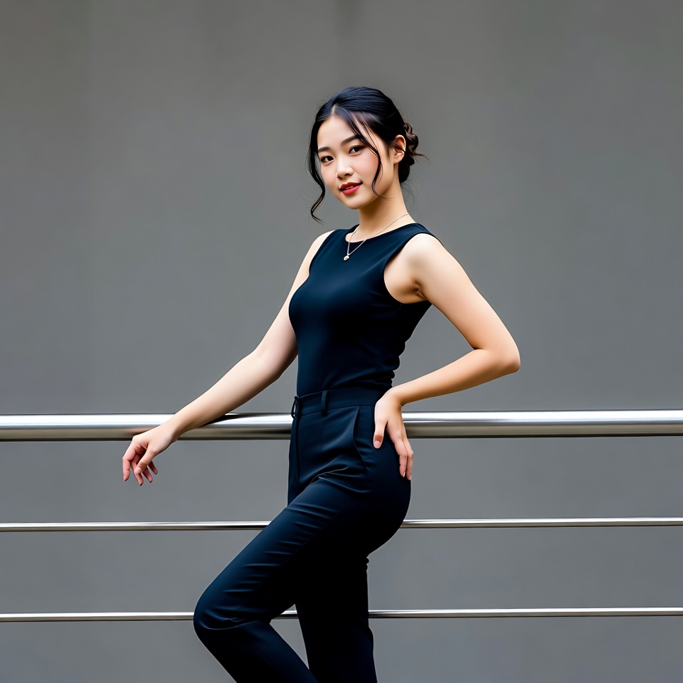A young Asian woman with black hair in an updo stands leaning against a metal railing. She wears a sleeveless black top and matching wide-leg pants, with one hand on her hip. The background is a plain gray studio setting.