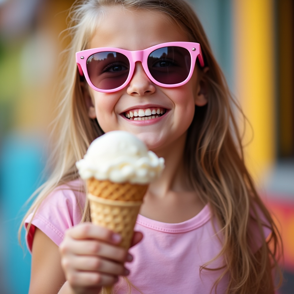 A young girl with long blonde hair smiles happily while holding a vanilla ice cream cone. She wears pink sunglasses and a pink t-shirt, standing in front of a colorful amusement park background with yellow and blue walls. Her eyes are covered by the tinted lenses as she enjoys the treat.