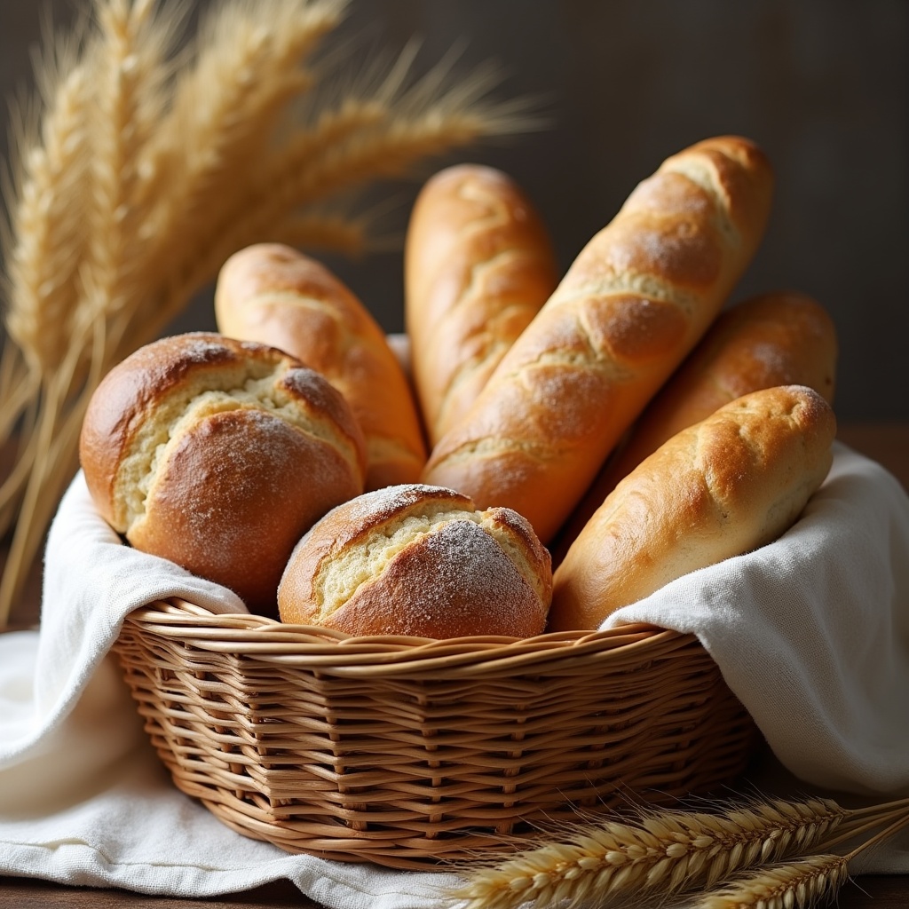 A wicker basket lined with white cloth holds several golden baguettes and powdered dinner rolls on a wooden table. Golden wheat stalks surround the basket, adding a rustic touch. The bread features crusty textures and fresh, baked appearances.