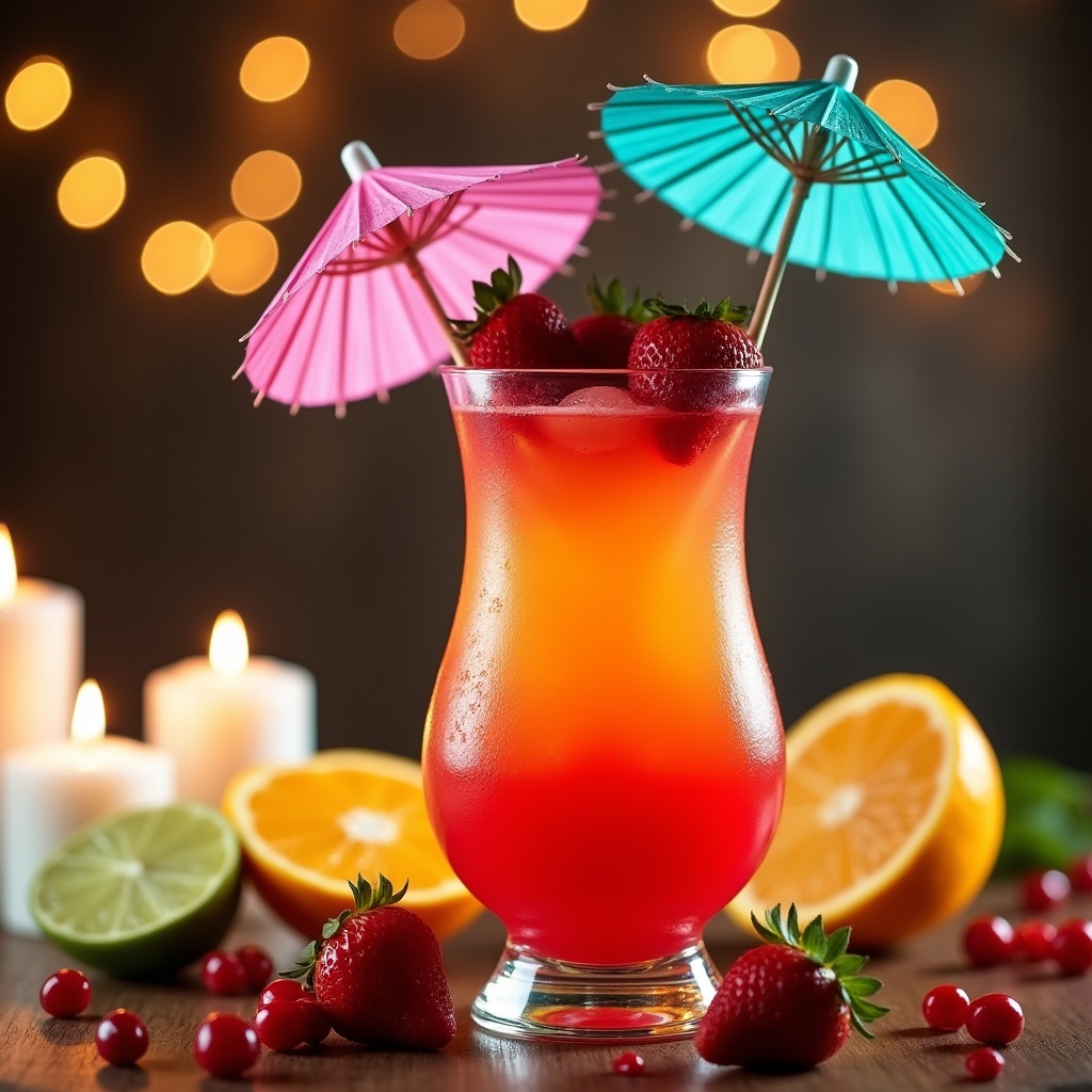 berry garnish, bokeh lights, candles, citrus slices, cocktail decoration, cocktail glass, cocktail umbrellas, exotic cocktail, festive background, fresh fruit, fruit garnish, garnished drink, lime wedges, mini parasols, orange juice, oranges, party drink, pink umbrella, red berries, strawberries, summer drink, tall glass, tropical drink, turquoise umbrella, vibrant colors, wooden surface, hurricane cocktail