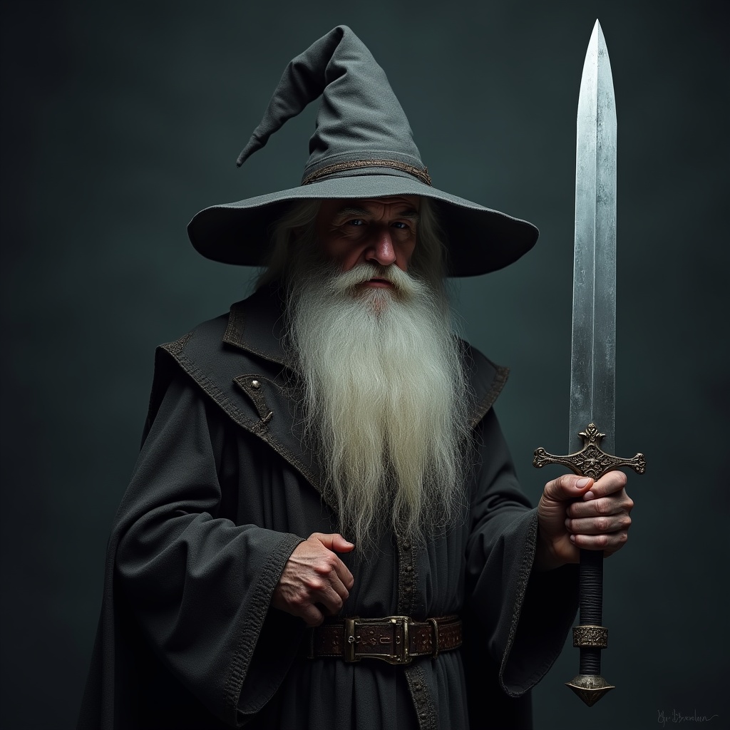 An elderly wizard with a long white beard and pointed gray hat stands holding a large ornate sword. He wears a dark hooded robe with a belt and stands against a dark background. His expression is stern and focused.