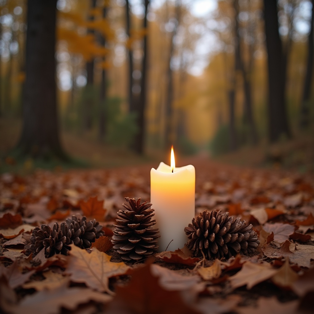 A white candle with a glowing flame sits on a bed of colorful fallen autumn leaves in a forest. Several pine cones are arranged around the base of the candle. Tall trees with yellow foliage create a blurred background.