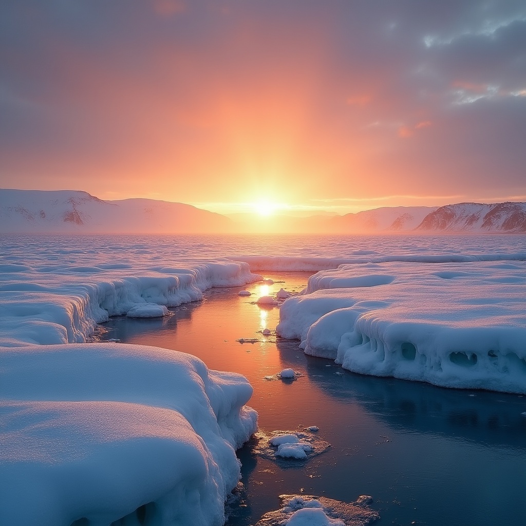 A vibrant sunrise illuminates a narrow channel of dark water cutting through expansive white ice floes in an Arctic landscape. Snow-covered mountains rise in the background under a cloudy sky with orange and pink hues. The sun's golden rays reflect off the ice edges and water surface.