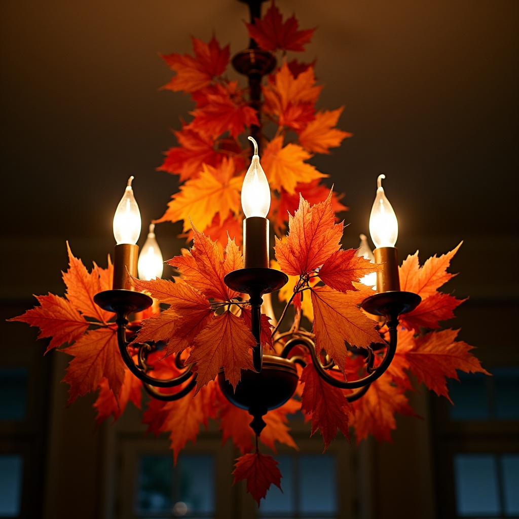 Thanksgiving decor, artificial leaves, autumn decoration, autumn leaves, brass chandelier, candlelight, candles, ceiling fixture, cozy lighting, dining room light, fall decor, fall leaves, festive chandelier, foliage, harvest decor, holiday decoration, indoor lighting, leaf garland, lit candles, maple leaves, orange leaves, red leaves, seasonal decor, warm lighting, chandelier