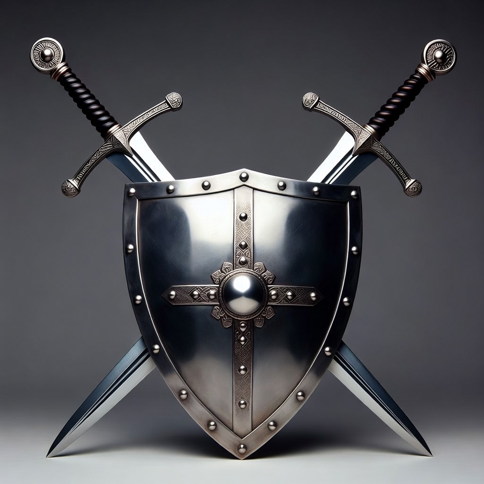 armor, battle gear, cross design, crossed swords, dark background, fantasy props, historical weapons, isolated background, knight gear, knight shield, medieval shield, medieval weapons, metal shield, ornate swords, shield boss, shiny metal, steel blades, weaponry, wooden hilts, swords