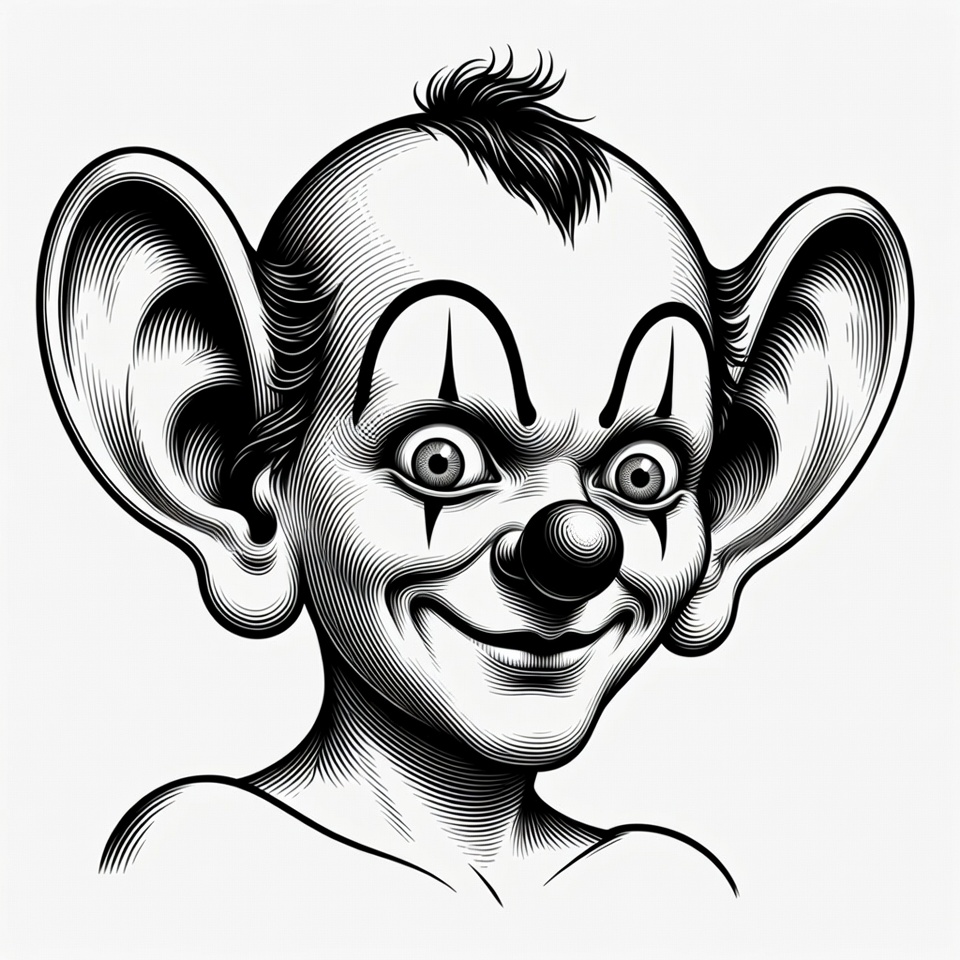 A black and white line art illustration depicts a cartoon clown with oversized ears, wide bulging eyes, and a big red nose. The clown has a mischievous wide smile, spiky hair on top, and arched eyebrows. It is shown in close-up on a plain white background.