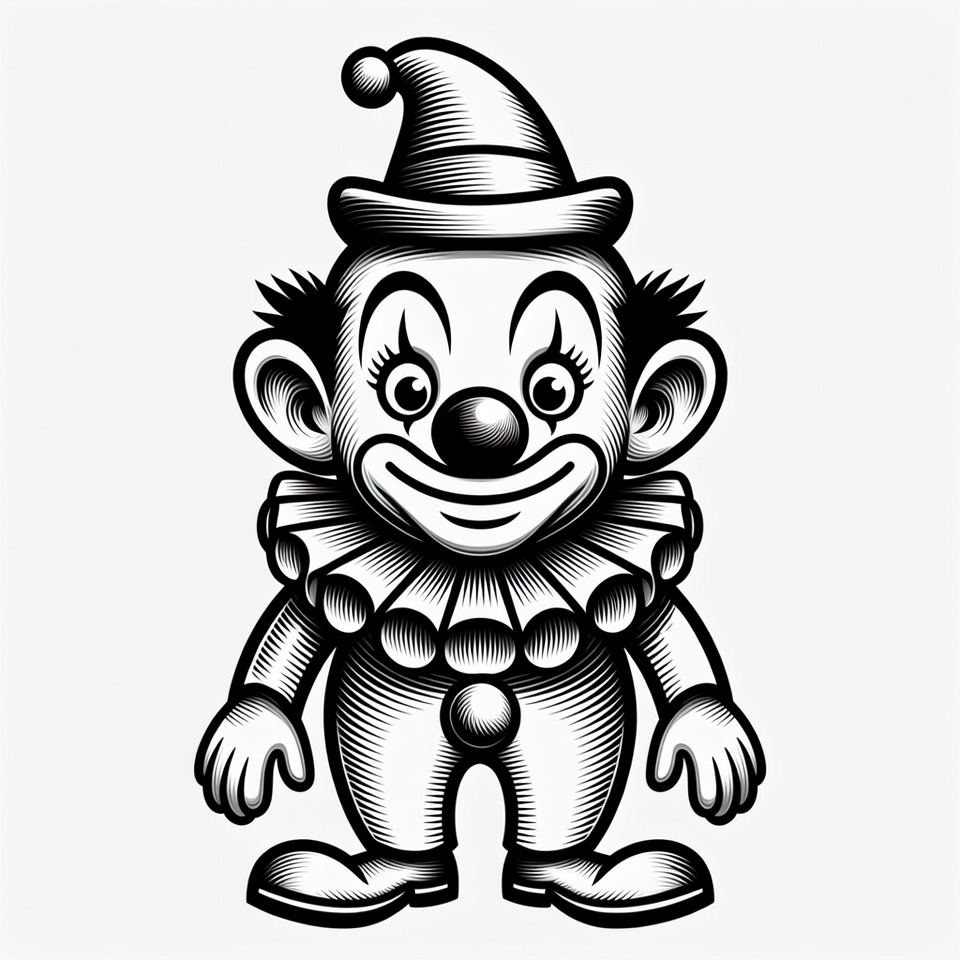 big shoes, black and white, cartoon clown, circus clown, clipart, fun clown, illustration, isolated background, line art, pointed hat, polka dots, ruffled collar, smiling clown, vector art, clown
