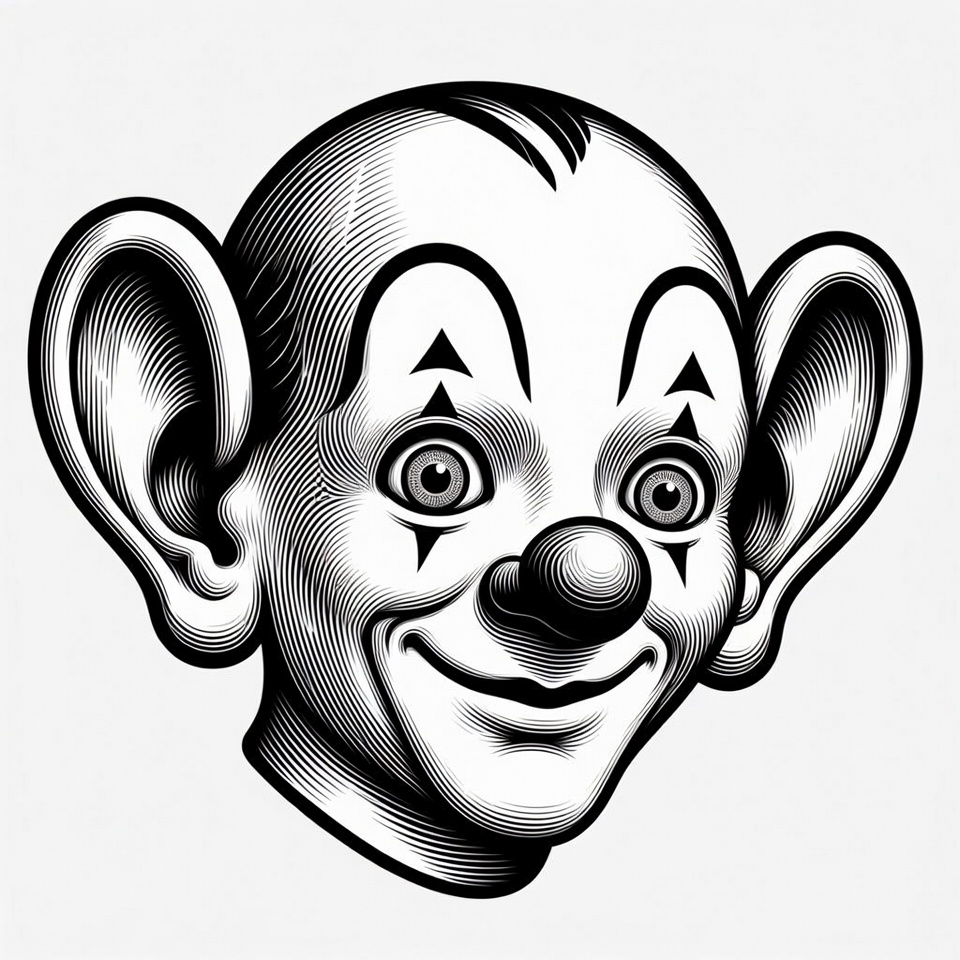 A black and white line art illustration depicts a cartoon clown head with large ears, wide smile, red nose, and triangular eyebrows. The clown has big excited eyes and exaggerated features in a classic style. It is isolated on a white background.