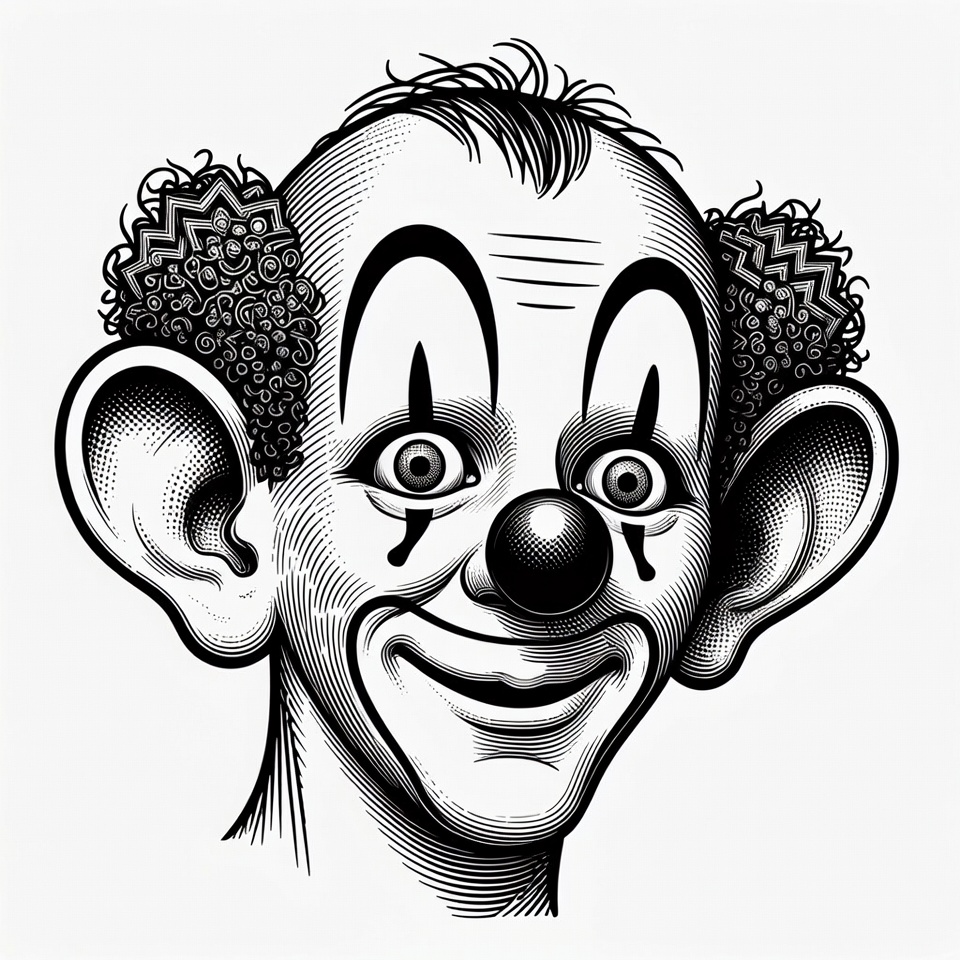 big nose, black and white, cartoon clown, clown face, curly hair, engraving style, funny clown, illustration, isolated background, line art, red nose, smiling clown, tears, wide smile, clown