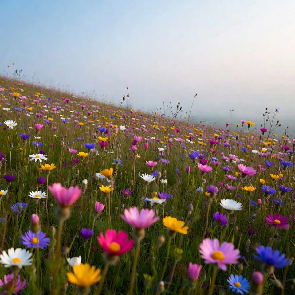 bloom, blue flowers, colorful flowers, daisy-like flowers, field, floral meadow, flower field, grass, hill, hillside, landscape, meadow, mist, nature, outdoor, petals, pink flowers, purple flowers, scenic, sky, stems, vibrant, white flowers, yellow flowers, wildflowers