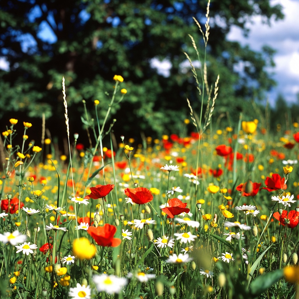 bloom, blue sky, buttercups, clouds, colorful flowers, daisies, field, floral, flowers, garden, grass, green tree, landscape, meadow, natural, nature, outdoor, poppies, red flowers, red poppies, summer flowers, tree, vibrant, white flowers, yellow flowers, wildflowers