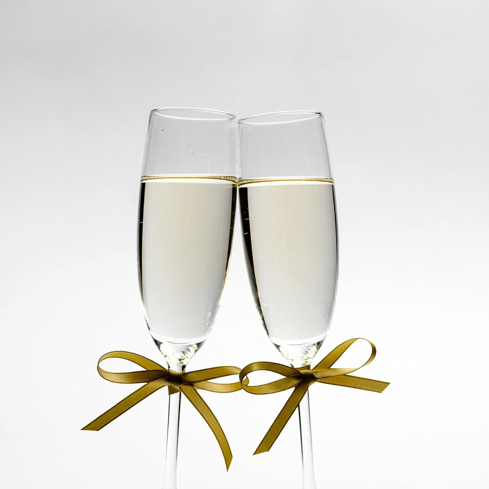 alcohol, beverage, bubbles, celebration, champagne, clinking glasses, drink, elegant, festive, flutes, gold ribbons, golden bow, isolated, luxury, new year, party, sparkling wine, stemware, toast, two glasses, wedding, white background, champagne glasses