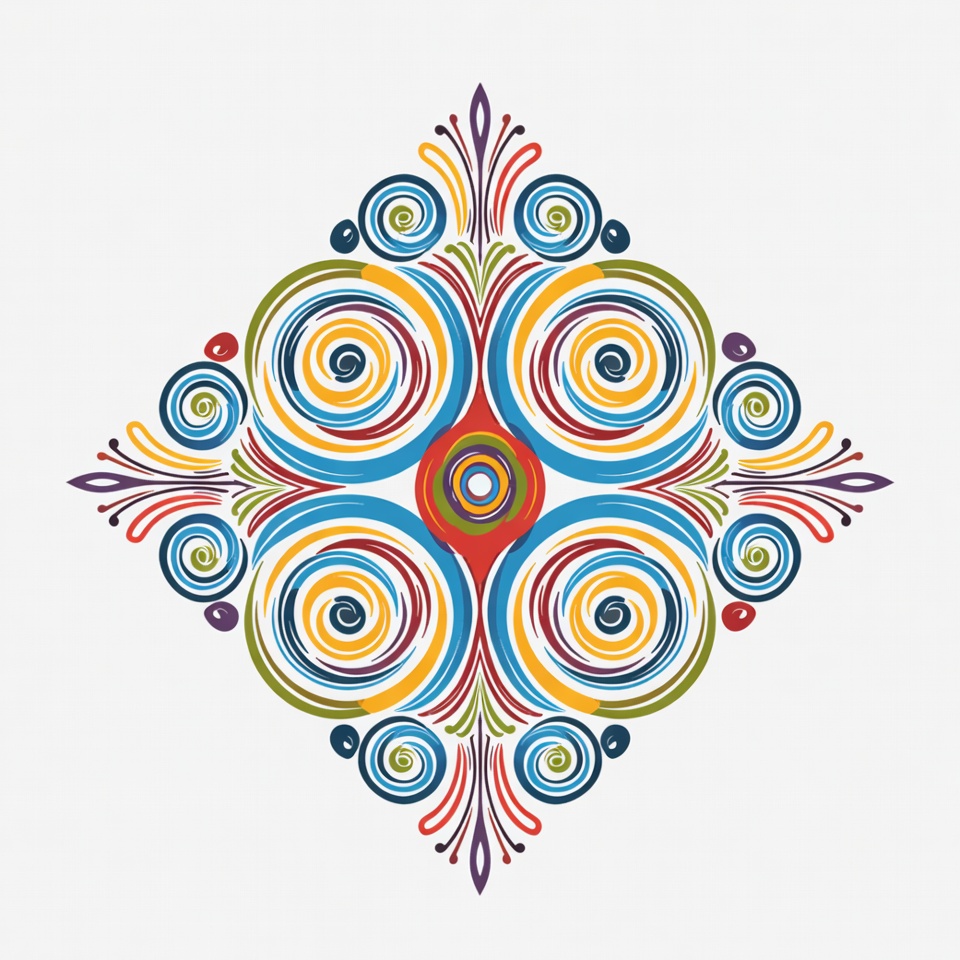 A vibrant abstract mandala features swirling circles and spirals in shades of blue, teal, purple, yellow, and red. Symmetrical floral-like patterns radiate from a central multicolored circle. The design is set against a plain white background.