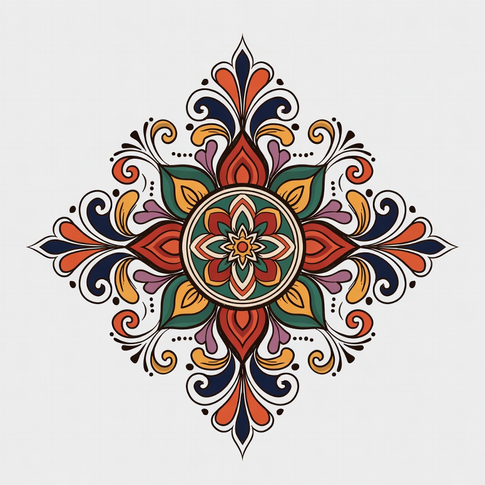 boho design, clipart, colorful mandala, decorative motif, ethnic pattern, floral design, flower center, geometric pattern, green blue, illustration, intricate design, isolated background, petal motifs, purple yellow, red orange, swirl patterns, symmetrical art, tattoo design, vector art, mandala