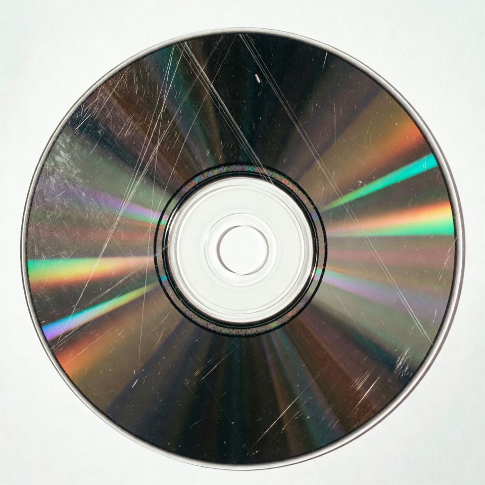 A close-up view of a scratched compact disc with visible scratches across its surface. The CD displays a rainbow iridescent sheen on a black background with a central white hub. It is isolated against a plain white backdrop.