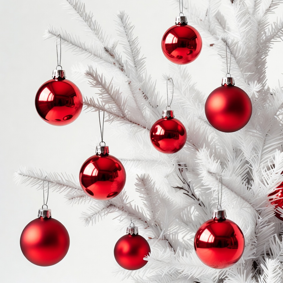 Red Christmas ornaments on white tree
