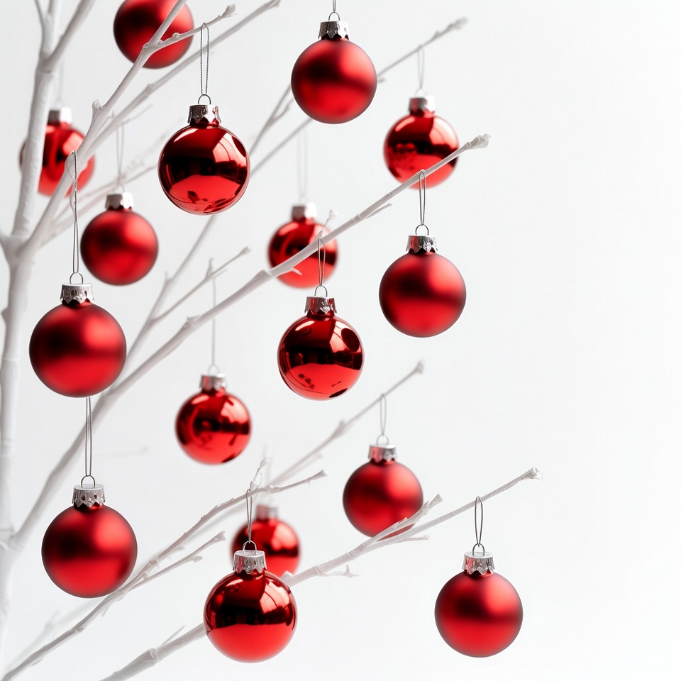 Christmas decor, Christmas tree, branch display, festive decor, glossy baubles, hanging ornaments, holiday decorations, ornament collection, red baubles, red spheres, shiny balls, white background, white branches, winter holidays, Christmas ornaments