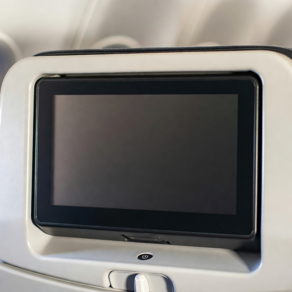 aircraft, airplane interior, aviation, black screen, cabin, control buttons, display, entertainment, gray headrest, headrest, in-flight, monitor, overhead panels, passenger seat, screen, seatback, travel, white upholstery, airplane