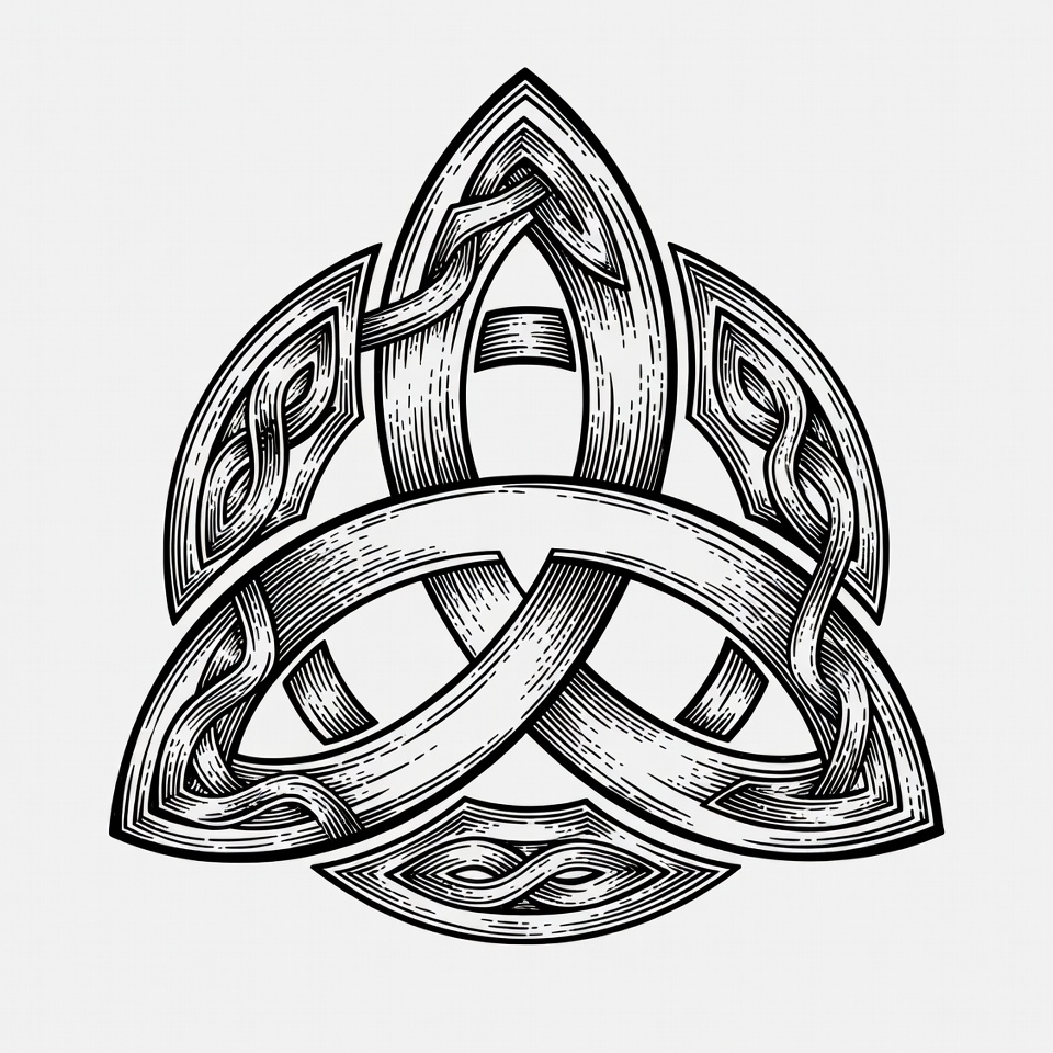 Celtic knot, Celtic symbol, Irish symbol, ancient symbol, black white, illustration, interlaced, isolated background, knotwork, line art, mystic symbol, pagan symbol, three arcs, tribal design, trinity knot, vector art, triquetra
